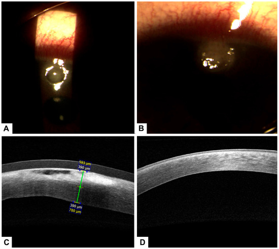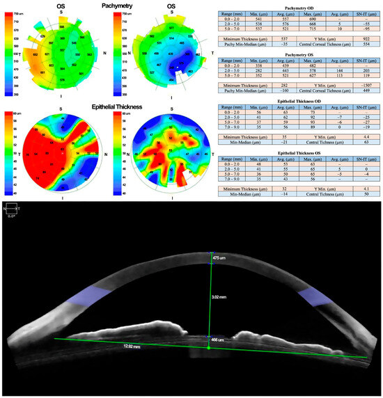 Due to a lack of adequate response, treatment with 100% PRGF eye drops was initiated at a dose of one drop every four hours for 14 days. Corneal pachymetry and OCT performed 48 h after initiating PRGF showed early signs of response, including stromal thickening indicative of regenerative activity (Figure 3).