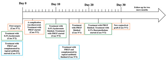 Initially, after being monitored weekly for the first month, the participants were then seen every two weeks until re-epithelialization was achieved at both the conjunctiva and cornea, depending on the clinical case. The patients were followed until defect closure and control of dry eye symptoms were achieved. This follow-up was monthly for 3 months, and during this follow-up period, intervention adherence and tolerability data were collected from medical records, photographs, and questionnaires. No adverse effects were reported. A summary of the follow-up can be observed in Figure 5 and Table 1.