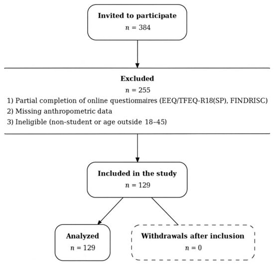 The recruitment process is summarized in Figure 1. The minimum required sample size was calculated a priori with G*Power 3.1 for a one-way ANOVA (medium effect size f = 0.25, α = 0.05, ** power = 0.80), yielding n = 128 [28]. To mitigate attrition and incomplete responses, 384 students were invited. Of these, 255 were excluded primarily due to partial completion of the online questionnaires (e.g., missing items in EEQ/TFEQ-R18(SP) or FINDRISC) and missing anthropometric data; a smaller subset did not meet eligibility criteria after screening (non-student status or age outside 18–45). The final sample comprised 129 participants (83 females (64.3%), 46 males (35.7%); mean age = 22.71 ± 5.22 years). Recruitment was conducted at the University of Extremadura (Cáceres, Spain) between November 2022 and March 2023 using convenience sampling. Participants were contacted via institutional email and provided electronic informed consent; additional recruitment strategies included QR-coded posters, social media outreach, classroom visits, and follow-up calls. Eligibility criteria are detailed below in Section 2.2.1 and Section 2.2.2.