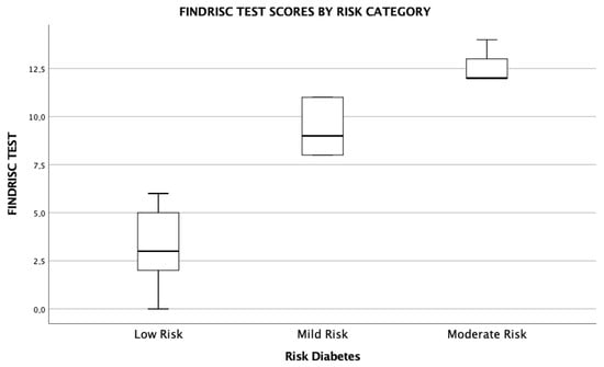 Figure 2 illustrates the graphical distribution of FINDRISC scores, grouped into three diabetes risk categories: low, moderate, and medium. The diagram reveals an upward trend: as the risk category increases, so does the median score, indicating that participants classified at higher risk tend to present higher values on the questionnaire. Additionally, greater score dispersion is observed within the moderate and medium risk groups, suggesting higher individual variability in these profiles.