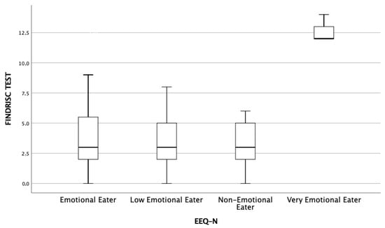 Descriptive analyses revealed that participants classified as Very Emotional Eaters had higher median FINDRISC scores, accompanied by greater score dispersion. Similarly, this group also exhibited slightly higher BMI values compared to the other profiles. Although no formal inferential tests were conducted in this section and no statistically significant differences were identified, these observed trends are clinically relevant. Figure 3 illustrates the distribution of FINDRISC scores across the four emotional eating profiles. A progressive increase in the median score is evident as the level of emotionality in eating behavior rises, with the Very Emotional Eaters group showing the highest median and the widest variability. These findings suggest that greater emotional reactivity to food intake may be associated with a more vulnerable metabolic profile. This evidence reinforces the importance of incorporating behavioral indicators, such as emotional eating, into preventive strategies for metabolic disorders, particularly within university student populations.