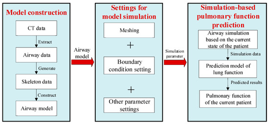 Purpose: The pulmonary function test holds significant clinical value in assessing the severity, prognosis, and treatment efficacy of respiratory diseases. However, the test is limited by patient compliance, thereby limiting its practical application. Moreover, it only reflects the current state of the patient and cannot directly indicate future health trends or prognosis. Computational fluid dynamics (CFD), combined with airway models built from medical image data, can assist in analyzing a patient’s ventilation function, thus addressing the aforementioned issues. However, current airway models have shortcomings in accurately representing the structural features of a patient’s airway. Additionally, these models exhibit geometric defects such as low smoothness, topological errors, and noise, which further reduce their usability. This study generates airway skeletons based on CT data and, in combination with convolutional surface technology, proposes an individualized airway modeling method to solve these deficiencies. This study also provides a method for predicting a patient’s lung function based on the constructed airway model and using CFD simulation technology. This study also explores the application of this method in preoperative prediction of the required extent of airway expansion for patients with large airway stenosis. Methods: Based on airway skeleton data extracted from patient CT images, a personalized airway model is constructed using convolutional surface technology. The airway model is simulated according to the patient’s clinical statistical values of pulmonary function to obtain airway simulation data. Finally, a regression equation is constructed between the patient’s measured pulmonary function values and the airway simulation data to predict the patient’s pulmonary function values based on the airway simulation data. Results: To preliminarily demonstrate the above method, this study used the prediction of FEV1 in patients with large airway stenosis as an example for a proof-of-concept study. A linear regression model was constructed between the outlet flow rate from the simulation of the stenosed airway and the patient’s measured FEV1 values. The linear regression model achieved a prediction result of RMSE = 0.0246 and R2 = 0.9822 for the test set. Additionally, preoperative predictions were made for the degree of airway dilation needed for patients with large airway stenosis. According to the linear regression model, the proportion of airway radius expansion required at the stenotic position to achieve normal FEV1 was calculated as 72.86%. Conclusions: This study provides a method for predicting patient pulmonary function based on CFD simulation technology and convolutional surface technology. This approach addresses, to some extent, the limitations in pulmonary function testing and accuracy caused by patient compliance. Meanwhile, this study provides a method for preoperative evaluation of airway dilation therapy.