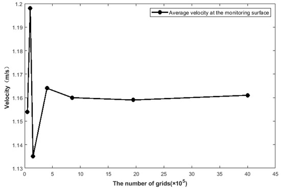 The results are shown in Figure 6: the abscissa represents the number of grids (ranging from 50,000 to 4.2 million), while the ordinate represents the average flow velocity at the monitoring surface, reflecting flow field stability. When the mesh count was small, the flow velocity at the monitoring surface fluctuated significantly between 1.1 and 1.2 m/s. This fluctuation arose due to insufficient mesh quality. Specifically, for complex structures, too low mesh count easily leads to mesh element distortion. This distortion, in turn, led to large deviations in flow velocity calculations and unstable results. When the mesh count increased to 3.2 × 105, the flow velocity stabilized at 1.164 m/s; further increasing the mesh count to 4.0 × 106 resulted in only a 0.3% change in flow velocity, and the computational results no longer varied significantly with increasing mesh count. Considering both simulation accuracy and computational efficiency, 3.2 × 105 was selected as the final mesh count, corresponding to an overall mesh size of 0.75 mm.