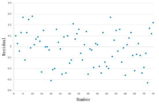 In this study, the outlet flow rate under the patient’s normal state was obtained from the predicted FEV1 values in the built-in reference equation of the Jaeger pulmonary function tester. To ensure the model’s reliability, this reference equation was validated: lung function data from 75 randomly selected healthy individuals were acquired, and a statistical analysis was performed on the measured FEV1 values versus the predicted FEV1 values from the Jaeger pulmonary function tester. The correlation between the two datasets was r = 0.97 (p < 0.05), indicating a strong correlation. The residual plot is shown in Figure 7, with a mean residual of 0.0144, a standard deviation of 0.15472, and a mean standard error of 0.01787 (p > 0.05). This result demonstrates that there is no significant difference between the predicted and measured values.