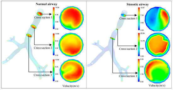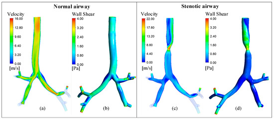 Furthermore, the convolution surface modeling technique used in this study exhibits significant methodological advantages. Compared with traditional Mimics modeling, the airway models constructed in this study have a smooth surface, free from geometric defects (e.g., low smoothness and topological errors) caused by protrusions or disconnected holes, effectively improving the usability of the models for CFD simulation. Meanwhile, the flow field comparative analysis in Figure 9. shows that the stenotic airway exhibits characteristics of increased flow velocity and concentrated WSS, which is fully consistent with the fluid dynamics theory of large airway stenosis. This further supports the physical rationality of the model and provides a reliable modeling method for subsequent similar studies.