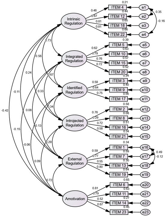A CFA was conducted with a total of 125 participants aged 9.63 (SD = 1.78) years, of whom 49.6% were girls. Figure 1 displays the resulting model from the CFA. To aid interpretation of the measurement model, we highlight that certain items exhibited lower factor loadings with their respective subscales. Specifically, item 4 (intrinsic regulation), item 3 (identified regulation), item 8 and item 21 (introjected regulation), item 1 and item 19 (external regulation), and item 14 (amotivation) all showed factor loadings below 0.50. By explicitly linking these questions to their associated subscales, we aim to facilitate the reader’s understanding of which items may be less representative within the overall scale structure (see Figure 1).