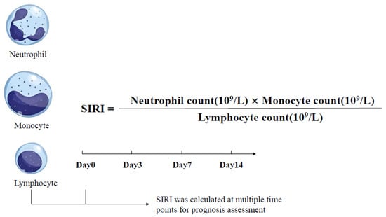 The SIRI was introduced as an indicator to assess the inflammatory and immune status of HBV-ACLF patients. It was calculated using the following formula [36] (Figure 1). All parameters in the formula were obtained from routine peripheral blood tests. SIRI values were calculated at baseline (day 0, the day of enrollment), and on days 3, 7, and 14 after admission.