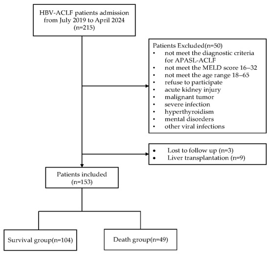 This study was designed as a prospective, multicenter clinical study. A total of 153 HBV-ACLF patients meeting the inclusion and exclusion criteria were enrolled from seven hospitals in China between July 2019 and April 2024: (1) The Fifth Medical Centre of the General Hospital of the People’s Liberation Army; (2) Beijing Youan Hospital of Capital Medical University; (3) Beijing Ditan Hospital Capital Medical University; (4) Tianjin Third Central Hospital; (5) Shijiazhuang Fifth Hospital; (6) Tongji Hospital of Tongji Medical University; and (7) Nanfang Hospital of Southern Medical University. This research received approval from the leading ethics committee, the Fifth Medical Center of the PLA General Hospital (2020041D) and was further reviewed and approved by the ethics committees of all participating centers. The study adhered to the ethical guidelines of the Declaration of Helsinki, 1964.