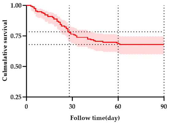 Kaplan–Meier curves showing the survival of all enrolled patients. Horizontal reference lines indicate TFS at 28 and 60 days. The red line with a shaded area indicating the 95% confidence interval.