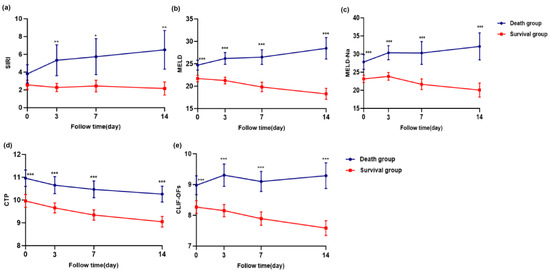 Longitudinal changes in SIRI, MELD, MELD-Na, CTP, and CLIF-C OF scores at days 0, 3, 7, and 14 were compared between the survival and death groups using linear mixed-effects models. As shown in Figure 4a–e, SIRI and disease severity scores were significantly higher in the death group (p < 0.05).
