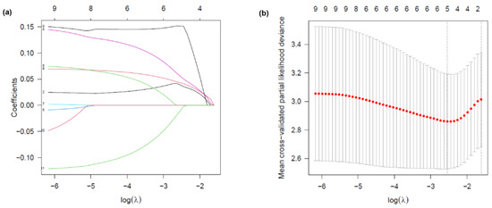 LASSO regression analysis for variable selection. (a) LASSO coefficient profile plot. Each colored line represents the coefficient trajectory of a candidate variable as a function of log(λ). Variables with non-zero coefficients at the optimal λ were selected for the model. (b) Selection of the tuning parameter (λ) in the LASSO Cox regression model using ten-fold cross-validation. Partial likelihood deviance is plotted against log(λ). Dotted vertical lines indicate the optimal lambda that minimizes the deviance, and the most regularized model within one standard error. Six variables with non-zero coefficients were selected at the optimal λ.