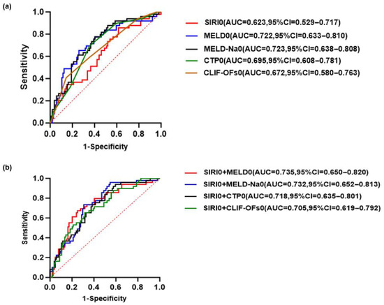 All statistical analyses were performed and figures plotted using R version 4.2 and GraphPad Prism version 10.1.2. Normally distributed continuous variables were presented as the mean ± standard deviation (SD), with group comparisons analyzed using the Student’s t-test. Non-normally distributed continuous variables were presented as median (interquartile range (IQR)), and group comparisons were conducted using the Mann–Whitney U test. Categorical variables were presented as frequencies and percentages, with group comparisons analyzed using the chi-square or Fisher’s exact test. Transplantation-free survival at 28, 60, and 90 days was analyzed using Kaplan–Meier analysis. Longitudinal changes in SIRI and disease severity scores (MELD, MELD-Na, CTP, and CLIF-C OFs) at days 0, 3, 7, and 14 were analyzed using linear mixed-effects models, with group, time, and the group × time interaction as fixed effects. The Bonferroni correction was applied for post hoc pairwise comparisons. Univariate and multivariate Cox proportional hazard regression models were used to identify predictors of 90-day mortality. Variables with p < 0.05 in the univariate analysis were entered into least absolute shrinkage and selection operator (LASSO) regression with ten-fold cross-validation to select optimal predictors and address multicollinearity. Receiver operating characteristic (ROC) curve analysis was conducted to assess the predictive performance of dynamic changes in SIRI combined with disease severity scores (MELD, MELD-Na, CTP, and CLIF-C OFs) for 90-day mortality. The area under the curve (AUC), sensitivity, and specificity were calculated to assess discriminative ability. p < 0.05 was considered statistically significant.