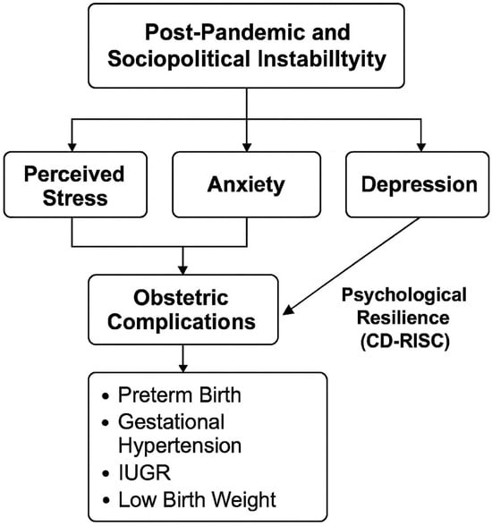 The conceptual diagram illustrates the hypothesized pathways through which post-pandemic and socio-political instability may contribute to adverse obstetric outcomes, mediated by elevated levels of perceived stress, anxiety, and depression during pregnancy. Psychological resilience is depicted as a moderating variable, potentially buffering the negative effects of psychological distress on maternal and fetal health. This model reinforces the rationale for integrating mental health screening into routine prenatal care, particularly during periods of widespread societal stress (see Figure 1).