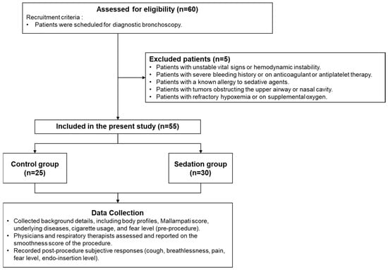 This prospective observational study was conducted at Taipei Medical University–Shuang Ho Hospital, a tertiary medical center located in northern Taiwan. Adult patients scheduled for diagnostic bronchoscopy (i.e., autofluorescence bronchoscopy or bronchoalveolar lavage) were recruited between February and October 2023. The research flow for recruiting participants is presented in Figure 1. Exclusion criteria included those with (1) unstable vital signs or hemodynamic instability; (2) a history of severe bleeding or current use of anticoagulant or antiplatelet therapy; (3) a known allergy to sedative agents; (4) the presence of tumors obstructing the upper airway or nasal cavity; and (5) with refractory hypoxemia or current oxygen support. All eligible participants were thoroughly informed about the objectives and procedures of the present study. Subsequent medical assessments were conducted, and relevant clinical history data were retrieved from medical records.