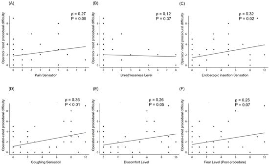 Correlations between operator-rated difficulty and patient-reported sensations. Each panel presents a specific sensation: (A) pain sensation, (B) breathlessness level, (C) endoscopic insertion sensation, (D) coughing sensation, (E) discomfort level, and (F) fear level (post-procedure). Spearman correlation coefficients (ρ) and corresponding significance levels (p) are displayed to indicate the strength and statistical significance of each correlation.