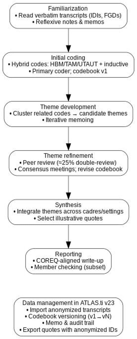 To enhance credibility, the supervisory team independently reviewed a subset (≈25%) of transcripts and the evolving codebook, with discrepancies resolved by consensus in scheduled analytic meetings. Informal member checking with a subset of participants was used to validate preliminary interpretations. The analytic workflow and data management sequence are summarized in Figure 1.