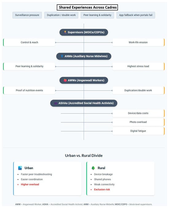 Work–Life Boundary Erosion: WhatsApp’s pervasiveness blurred the lines between professional and personal time. “Earlier, once the duty was over, I was free. Now, even at home, if a message comes, we must respond or give reasons” (ANM, flood-prone block, IDI). Many CHWs noted increased stress and disruption to family life. To clarify the workload dynamics, Table 4 contrasts how WhatsApp reduced and increased work across cadres and settings, with exemplar quotes.