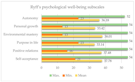 Descriptive analyses revealed that caregivers reported moderate to high levels of psychological well-being. Among the Ryff subscales, the highest mean score was observed for Environmental Mastery (M = 38.01, SD = 8.70), followed by Self-Acceptance (M = 37.78, SD = 8.16) and Positive Relations (M = 37.48, SD = 7.73). The lowest mean was recorded for Purpose in Life (M = 33.14, SD = 6.72), closely followed by Personal Growth (M = 33.42, SD = 8.68) (Figure 1).