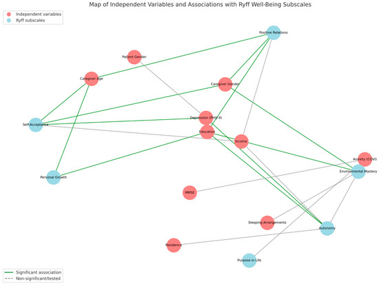 A visual synthesis of the tested associations is provided in Figure 2, which illustrates both significant and non-significant pathways between independent variables and the six Ryff dimensions. The figure highlights the central role of education, age, gender, and depression in shaping caregiver well-being, while also demonstrating the absence of effects for variables such as income, residence, and patient gender. Significant associations are reported in Table 4, complementing the graphical overview.