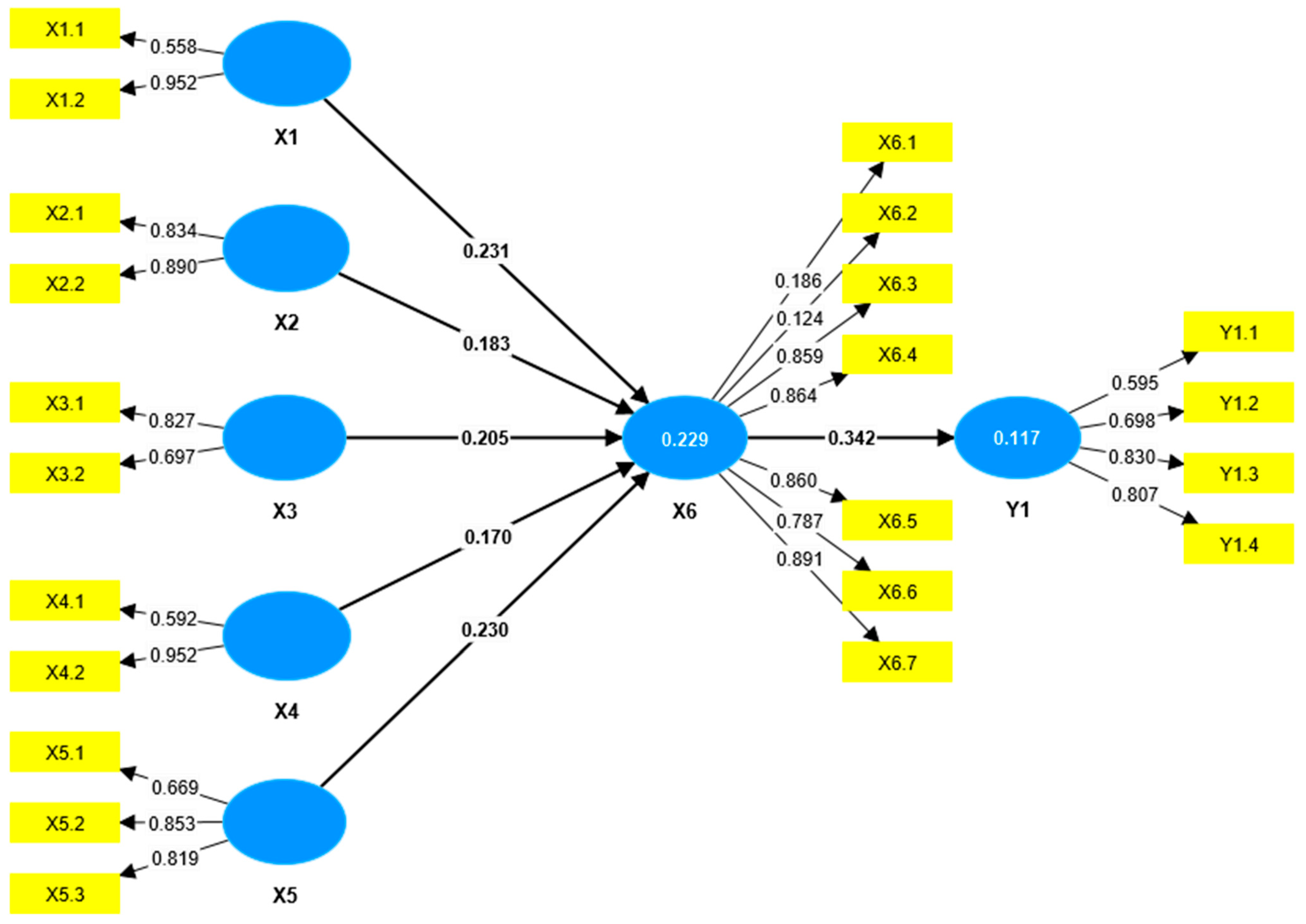 Among the measured indicators, the highest contribution to demographic factors (X1) was from environment (loading factor = 0.958); for educational factors (X2), from maternal knowledge (loading factor = 0.888); for technological factors (X3), from technology ownership (loading factor = 0.783); for economic factors (X4), from income level (loading factor = 0.970); for cultural values (X5), from posyandu participation (loading factor = 0.829); and for quality (Y1), from dietary diversity (loading factor = 0.856).