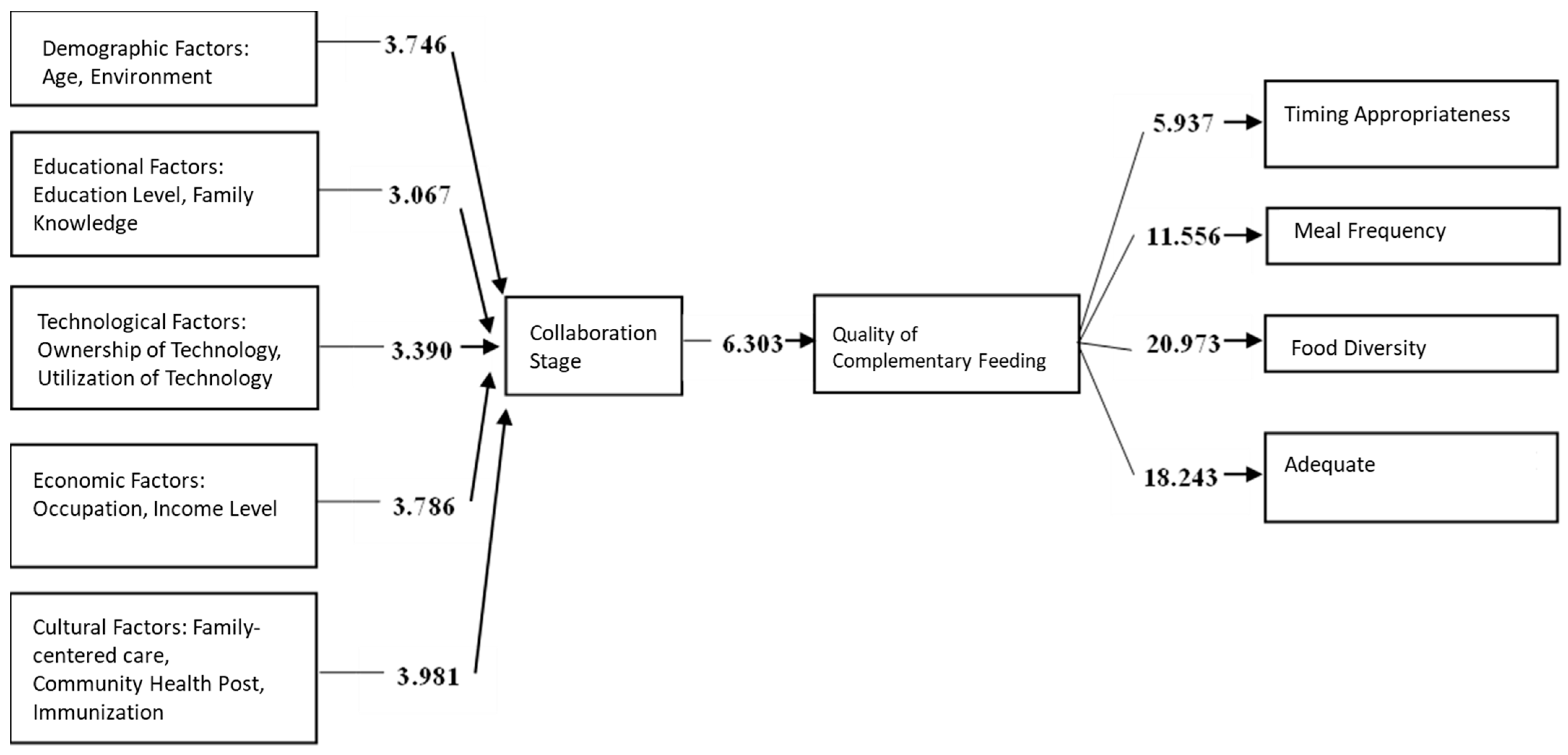 p-values less than 0.05, indicating statistical significance. These findings suggest that Demographic Factors (X1), Educational Factors (X2), Technological Factors (X3), Economic Factors (X4), and Cultural Values (X5) significantly influence the Quality of Complementary Feeding (Y1) through Family Empowerment (X6). In other words, Family Empowerment (X6) serves as a significant mediator in the relationship between these factors and complementary feeding quality.