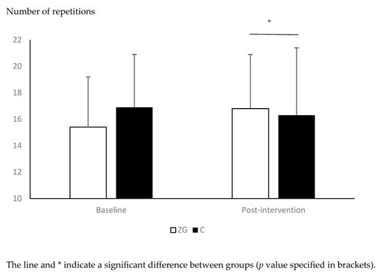 Changes in sit-to-stand (STS) performance between pre- and post-intervention in the Zumba Gold® (ZG) and control (C) groups.