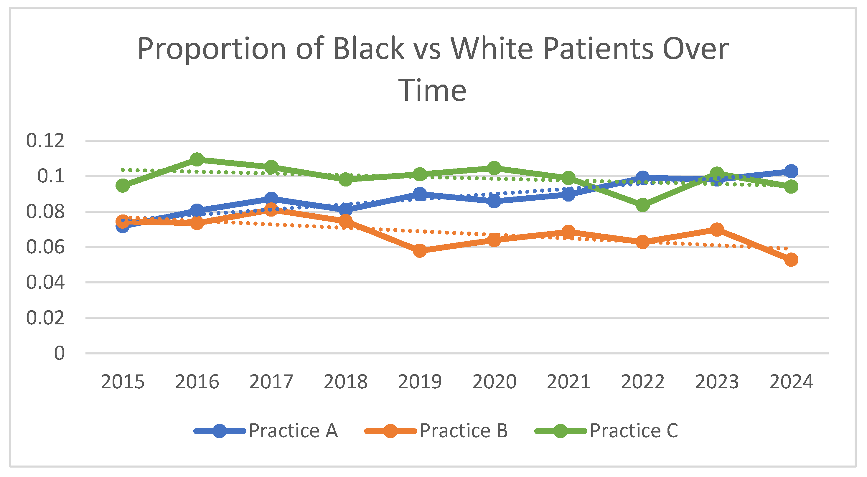 Figure 1). Regressions show a similar trend, with the increased likelihood of seeing a Black patient linearly increasing over time in Practice A as a whole. A visit in 2024 was 49% more likely to be with a Black patient compared with 2015 (adj OR: 1.49; 95% CI: 1.17, 1.88). The proportion of Black patients began to statistically significantly increase in 2021, two years after the addition of the second Black physician. There was no significant increase in Black patients in Practice B or C during the study period. In fact, in practice B, there was a statistically significant decrease in the likelihood of seeing a Black patient in 2024 compared with 2015 in Practice B [adj OR 0.68 (95%CI: 0.51, 0.91)].
