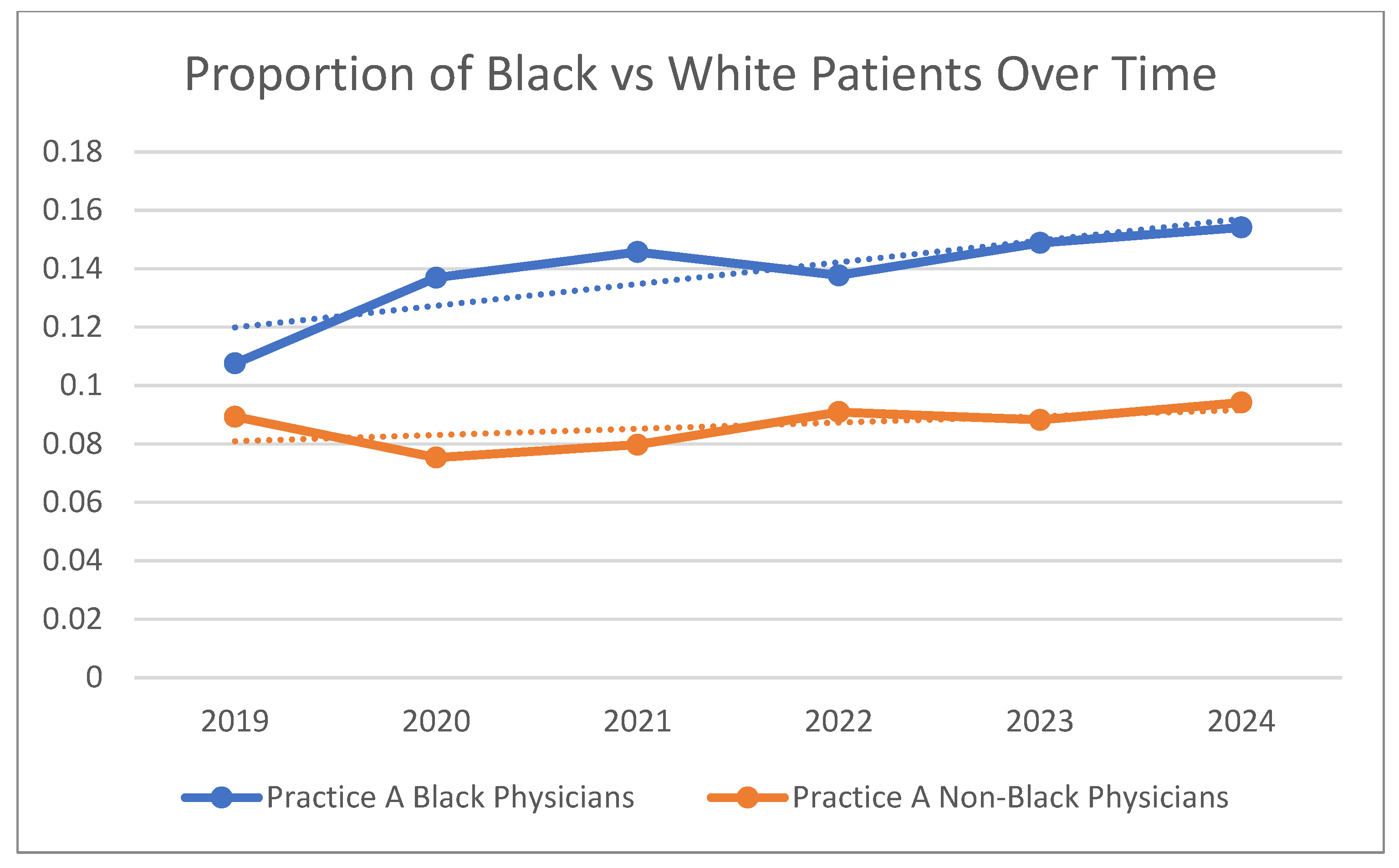 We then evaluated the proportion of Black patients seen by Black and nonBlack physicians, independently, within Practice A from 2019 to 2024.