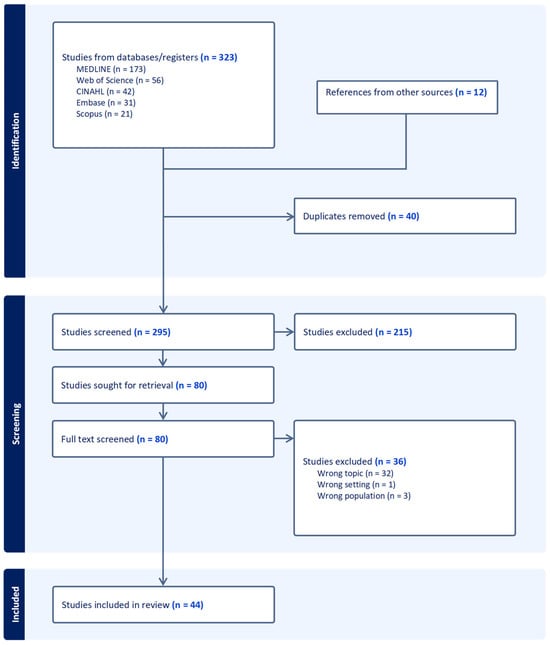 From the literature search, a total of 323 studies were identified through database searches, with an additional 12 studies found via hand-searching relevant materials and bibliographic references. All retrieved articles were imported into Covidence for the removal of duplicates. Title and abstract screening were conducted within Covidence, after which the remaining 80 articles were exported to Zotero for full-text review. Based on the defined inclusion and exclusion criteria, 36 articles were removed, leaving 44 studies for inclusion in the review (see Figure 1). The characteristics of these included studies are detailed in Table 1. All retrieved studies were written in English; therefore, only English written articles were kept. Most included studies (39/44, 89%) have been published in the past 10 years (2014 to 2024). A large share of the selected articles are systematic reviews (22/44, 50%), including 15 meta-analyses. Regarding the quality assessment, all included studies demonstrated medium to high methodological quality. Among the 44 articles appraised, 25 (57%) obtained a score of 4/5, while 19 (43%) achieved the maximum score of 5/5. No study was rated below 4/5, reflecting the generally high quality of evidence (see Table 1).