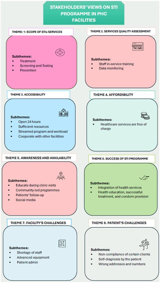 Eight major themes and twenty-six sub-themes (see Figure 2) emerged from stakeholders’ perspectives on STI services.
