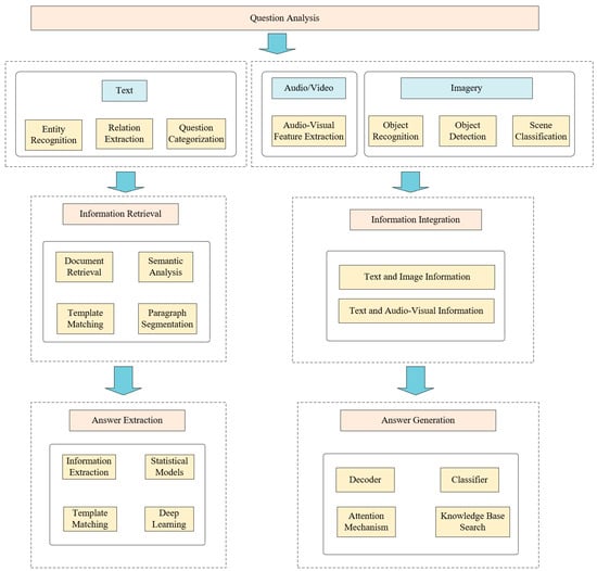 The QA structural framework comprises three core phases (Figure 1): question analysis, information retrieval, and answer extraction. Firstly, features are extracted from the multimodal information input by the user, such as text, image, audio, etc., and fused into a unified representation. Next, relevant data are retrieved and filtered from knowledge bases or document collections. Finally, concise answers are generated through template matching, semantic parsing, or deep learning techniques [10].