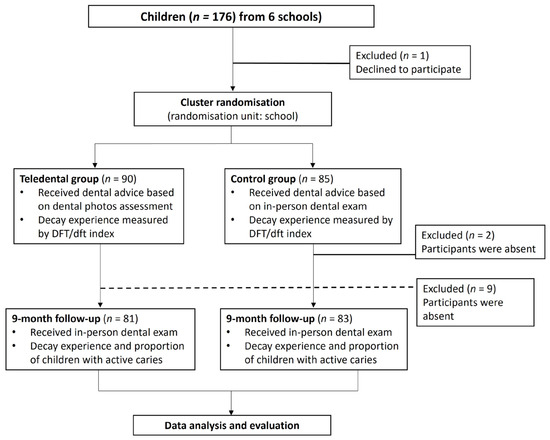 Despite the promising potential of teledentistry, there is a paucity of clinical trials assessing its effectiveness and cost-effectiveness in improving children’s oral health by facilitating access to preventive oral care. Most existing studies concerned with children’s oral health are observational, pilot, or diagnostic validation studies [24,25]. Building on previous work [26] that validated the use of teledentistry for remote dental screening, the present clinical trial aimed to evaluate the efficacy of teledentistry in enhancing access to preventive oral care and improving oral health outcomes in school-aged children compared with routine oral care. This study hypothesised that teledentistry would be as effective as traditional preventive oral care (i.e., in-person dental screening and patient education) in improving schoolchildren’s oral health.