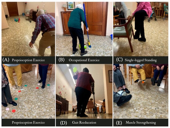 Figure 2. Multicomponent Occupational Therapy Intervention. This figure illustrates core activities used in the multicomponent program, categorized by their therapeutic goals: (A) Proprioception exercises: Balance tasks involving visual occlusion, unstable surfaces, or precise foot placement to improve spatial awareness and joint position sense (e.g., bowling while standing on foam, ‘Twister’-style stepping games). (B) Occupational exercise: Functional tasks simulating real-life activities, such as sweeping or object collection, to enhance occupational performance and lower-limb coordination. (C) Single-leg standing: Static balance exercise aimed at improving postural stability and ankle strategy. (D) Gait reeducation: Dynamic activities like balloon walking to promote rhythmic movement, weight shifting, and safe ambulation. (E) Muscle strengthening: Resistance tasks using balls or bands to target lower-limb strength (e.g., leg lifts with ball, knee squeezes) to support functional mobility.- ○