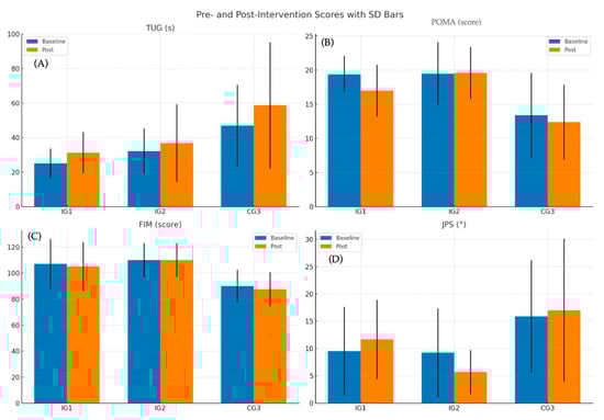 Specifically, the CG3 showed the poorest initial performance in the TUG (47.0 ± 23.7 s). IG2 presented intermediate results (32.2 ± 13.2 s), while IG1 was the fastest (25.1 ± 8.61 s). A similar pattern was observed in the POMA scores, with CG3 scoring the lowest (13.4 ± 6.21) compared to IG1 (19.4 ± 2.69) and IG2 (19.5 ± 4.61). In terms of FIM, CG3 also showed reduced functional independence (90.1 ± 12.3) relative to IG1 (107 ± 19.4) and IG2 (110 ± 13.0).