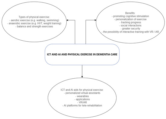 Given the heightened risk of falls in PwD, multi-component exercise focusing on muscle strength and balance is also crucial [11], although specific parameters for strength training in this population are still being defined. Recognizing the unique nature of each individual’s condition to make plan for personalized exercise underscores the importance of tailoring rehabilitation approaches, including physical activity, to their specific needs [4]. It is important fo make a personalized plan for exercise for PwD with regard to wishes and, stage of dementia, knowledge and capabilities of carers and possibilities to use ICT/AI in regular exercise of PwD. However, several factors can affect participation and adherence to these programs, including significant cognitive impairments that hinder the ability to follow instructions and remember routines, as well as behavioral symptoms like agitation [12,13], where use of AI/ICT plays also tole of monitoring to increase safety and regular adaptation regarding stage of dementia. Entirely self-directed interventions may not be appropriate, even in the early stages of dementia [14], highlighting the importance of support networks. The social aspect of physical activity also plays an important role in maintaining self-identity [15] and promoting social inclusion within the community [16] to empower lives of PwD and also lives of their carers in home environment.