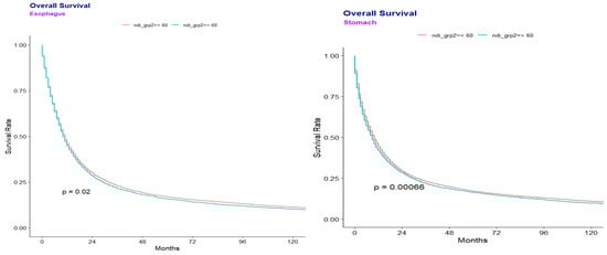 Median overall survival (OS) was lower in disadvantaged areas for gastric cancer: 9.0 months (NDI ≥ 60) vs. 10.0 months (NDI < 60) (p = 0.0007). Similar results were seen for esophageal cancer at 10.0 months (NDI ≥ 60) vs. 11.0 months (NDI < 60) (p = 0.020). (Figure 1). Multivariate regression analysis for the combined gastroesophageal adenocarcinoma cohort showed that NDI ≥ 60 was independently associated with worse OS (HR 1.027, p = 0.017) (Table 2).