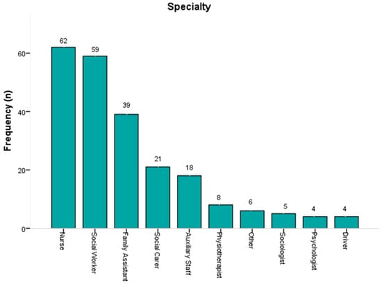The participants of the present study include members of the healthcare teams of various specializations (social workers, nurses, social caregivers, support personnel, etc.), educational backgrounds, and employment status (permanent or temporary staff). All specialties were included in the study to ensure a representative overview of the workforce employed in these services. Different specialties contribute at different levels to the daily operation and care of older people; therefore, their participation in the research offers a holistic perspective on the demands and challenges encountered in these settings.