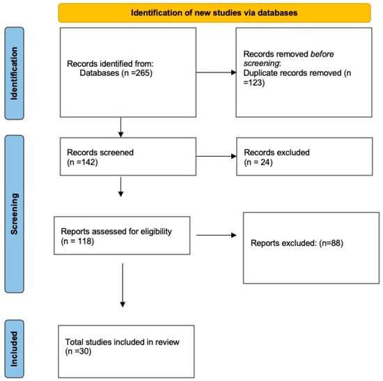 The database search and screening process are summarized in the PRISMA-ScR flow diagram (Figure 1). A total of 265 records were initially identified through PubMed, Scopus, and ScienceDirect. After removal of 123 duplicates, 142 records were screened by title and abstract, with 24 excluded for lacking a full text or an English version. In total, 118 full-text articles were assessed for eligibility, of which 88 were excluded because they did not specifically focus on paramedics as the study population. Ultimately, 30 studies met the inclusion criteria and were retained for analysis.