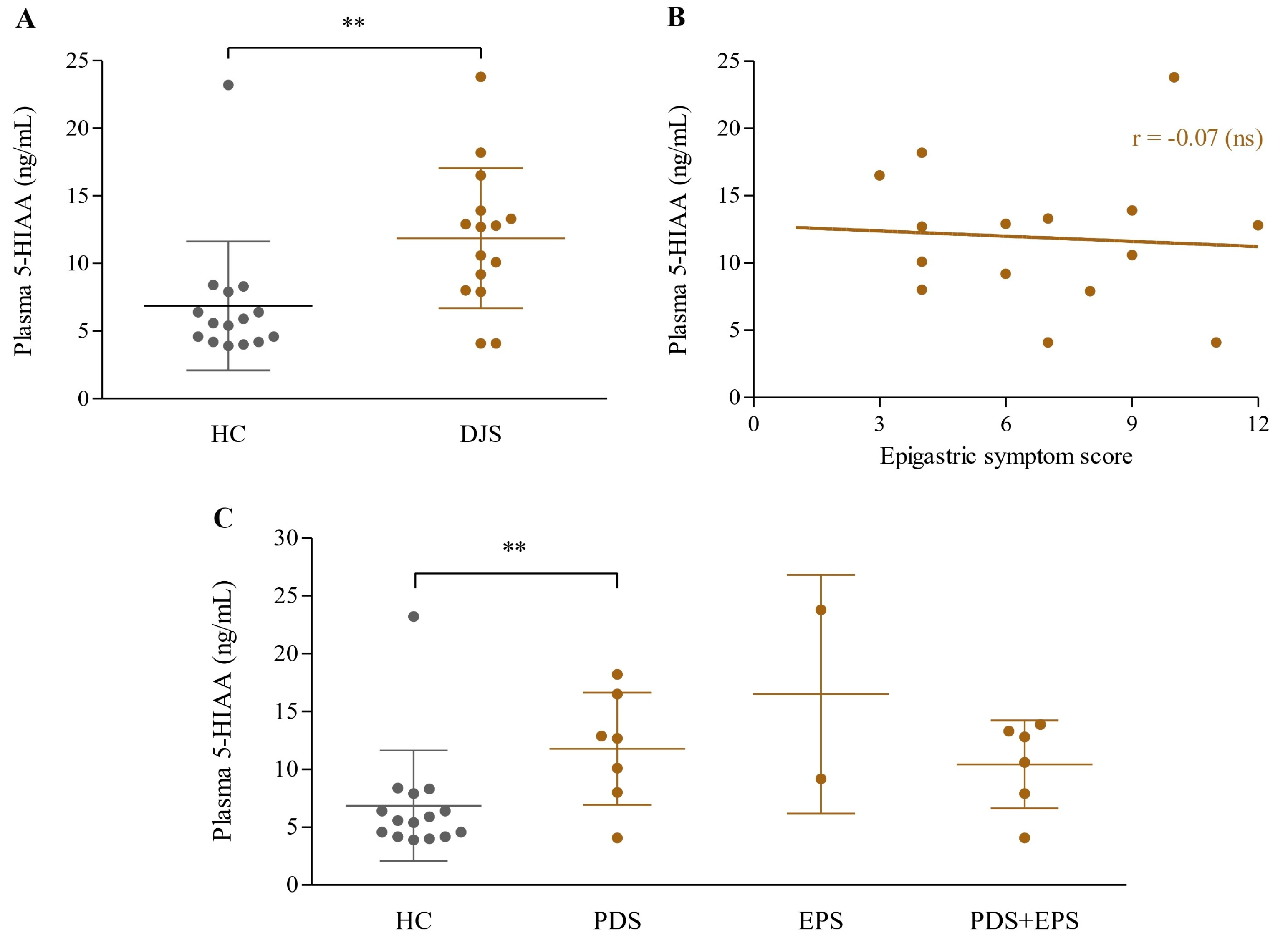 - Wiśniewska-Jarosińska, M.; Harasiuk, A.; Klupińska, G.; Śmigielski, J.; Stec-Michalska, K.; Chojnacki, C. Diagnostic value of measuring serum serotonin and urinary 5-hydroxyindoleacetic acid concentration in the diagnosis of functional dyspepsia. Gastroenterol. Rev. 2010, 5, 285–291. [Google Scholar] [CrossRef]