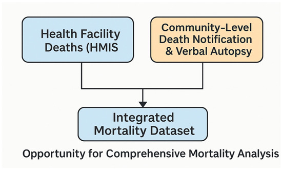 Furthermore, HMIS captured deaths, while readily available, and operationally important for health system management, usually underrepresent deaths that occur outside health facilities. We propose that methodological options for integrating facility-based and community-based deaths be explored in the research to generate a more robust and integrated picture of deaths. Subsequent studies could explore a methodological framework for mortality data estimation at the local or district level, which integrates multiple data sources and employs robust statistical techniques. The methodological frame will take into account health facility and community-based deaths at the district level, allowing for a more refined understanding of mortality patterns. Currently, methods to achieve such robust estimates, where facility and community deaths are combined at the local level, are sparse in the literature. Early work on such frameworks for combining facility and community deaths for all-cause mortality estimation in Sub-Saharan Africa has commenced, with the work of Issah et al. [44]. In Tanzania, a study by Whiting et al. has generated mortality estimates from community- and facility-based data sources using this approach. In their paper, data from sentinel vital registration (SVR) with verbal autopsy (VA) were used to determine the mortality burden at the community level in two areas of the United Republic of Tanzania. In their analysis, proportional cause-specific mortality structures obtained from health facility information systems were applied to counts of deaths obtained from the community-based sentinel system to generate robust and integrated mortality estimates [45]. Figure 2 provides a conceptual schema for integrating community and facility-based mortality data for comprehensive mortality estimation.