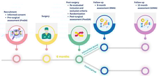 When normality was confirmed, parametric tests were applied. The assumption of homogeneity of variances was assessed using Bartlett’s test, with a significance threshold of p < 0.01. If variances were unequal, Welch’s t-test was used; otherwise, the standard Student’s t-test was performed. The Mann–Whitney was used for non-parametric variables. The Chi-squared tests were used to assess differences in categorical variables (Surgery type and side, gender, educational level, occupation, and family status). Repeated measures ANOVA were performed to evaluate within-group and between-group differences across time points for each outcome variable. The assumption of sphericity was tested using Mauchly’s test; when violated, the Greenhouse–Geisser correction was applied. Pairwise post hoc comparisons were conducted using independent t-tests with Sidak correction for multiple comparisons. The level of statistical significance was set at p < 0.05 for all analyses.