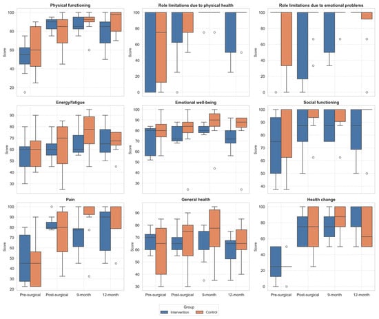 In the CG, significant improvements were observed in the Pain domain, with differences between PreSA and 9MA (p = 0.005), in Health change domain with differences between PreSA and PostSA (p < 0.006), PreSA and 9MA (p < 0.001), and PreSA and 12MA (p = 0.026).