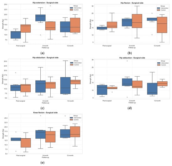Boxplot of changes in muscle strength across follow-up assessments in the operated limb. (a) Hip extension; (b) Hip flexion; (c) Hip abduction; (d) Hip adduction; (e) Knee flexion. Outliers, values outside the range of 1.5*IQR, are shown as circles.