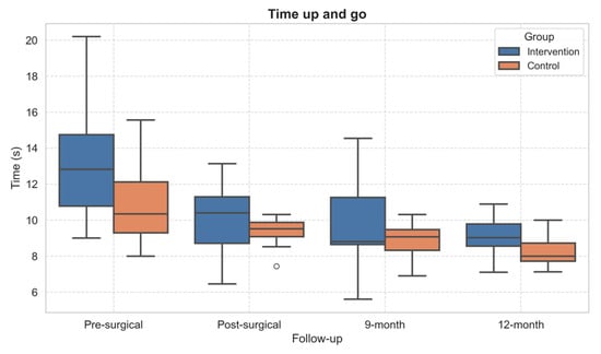 Boxplot of Timed Up and Go test performance across follow-up assessments. Outliers, values outside the range of 1.5*IQR, are shown as circles.