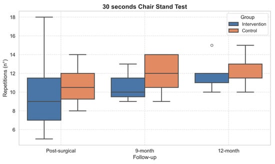 Boxplot of 30-Second Chair Stand Test performance across follow-up assessments. Outliers, values outside the range of 1.5*IQR, are shown as circles.