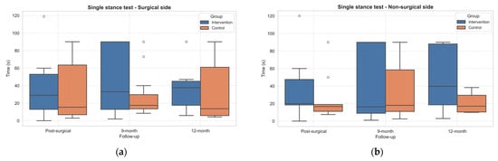 Boxplots of Single Stance Test results (expressed in seconds) on the surgical (a) and non-surgical (b) sides in both groups across follow-up assessments. Outliers, values outside the range of 1.5*IQR, are shown as circles.