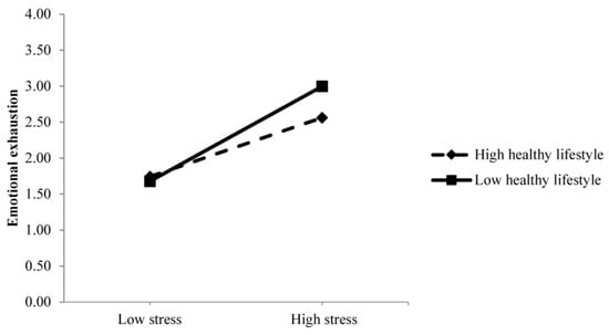The results of the mediation analyses (Table 2) revealed that emotion regulation (first) and stress (second) mediated the relationships (a) between work demands and emotional exhaustion; (b) between self-efficacy to cope with stress and emotional exhaustion; and (c) between healthy lifestyle and emotional exhaustion, confirming H1, H2, and H3, respectively. Moreover, when performing the serial mediation analysis with healthy lifestyle as the predictor (Model 3), the test for interaction between healthy lifestyle and stress on emotional exhaustion was significant (F (1, 184) = 5.719, p = 0.018), confirming H4 about the moderating role of healthy lifestyle on the relationship between stress and emotional exhaustion. The moderating role of healthy lifestyle can be observed in Figure 2.
