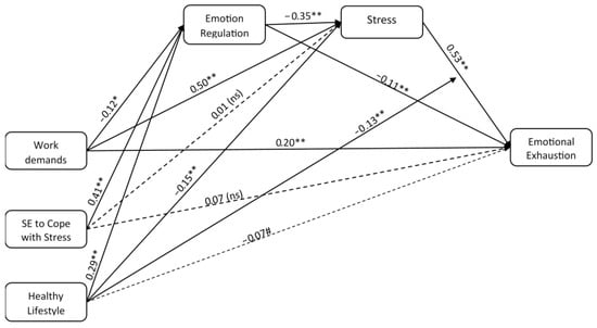 Table 1 shows the correlations among the variables of the study. Results revealed significant intercorrelations in the predicted directions, providing preliminary evidence of the hypotheses of this study. Higher work demands were strongly associated with higher levels of stress, and the latter resulted strongly associated with emotional exhaustion. Moreover, having a healthy lifestyle was moderately associated with lower stress, higher emotion regulation, and lower emotional exhaustion. Another notable aspect was that significant sex differences were found in the correlations with stress, emotion regulation, and emotional exhaustion.