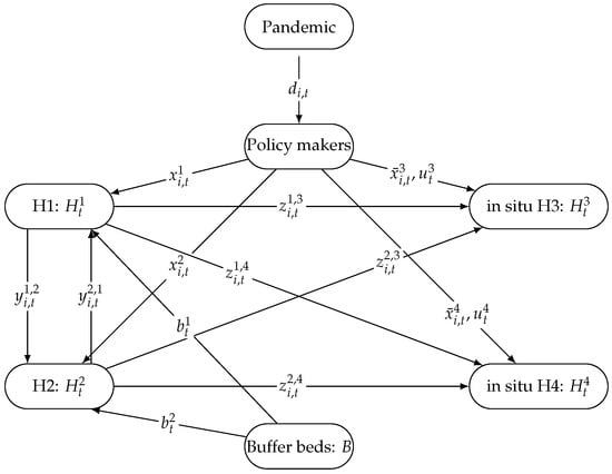 In Figure 1, we present an illustrative example of the underlying mechanism of the problem at time t for patients of type i. In this example, we consider a pandemic as a source node that is flowing patients into the healthcare system. The number of patients of type i is denoted as . The node Policy makers represents healthcare agencies who are responsible for admitting patients into the system and distributing them to the hospitals and in situ hosptials. In this toy problem, we are only showing two hospitals, and , and two in situ hospitals, and . As such, we denote by , , , and the number of patients assigned to , , and in situ hospitals and (resp.). Hospitals, on the other hand, can make decisions to redistribute patients and transfer them between each other and to in situ hospitals with variables , , , , , and . Note that in situ hospitals can only admit patients if they are open and operating. This is represented with the variables and . Buffer beds (non-pandemic beds) B are to be split over hospitals with variables and . Each hospital and in situ hospital can track their number of occupied beds with a state variable denoted as , , , and . Now that we have defined the decision variables in this toy problem, we now move towards defining the constraints of the problem. To that end, Equation (3) presents two constraints: the one on the left guarantees that buffer beds borrowed by and cannot exceed B. The one on the right states that the number of occupied beds in and cannot exceed the capacity of and , i.e., and . Equation (4) also presents two constraints: the one on the left basically states that the total number of tents needed to operate the opened in situ hospitals and has to be less than the available number of tents O. The one on the right guarantees that, if and are opened, the number of occupied beds in and cannot exceed the capacity of and , i.e., and . Equation (5) provides a constraint guaranteeing that all transferred patients out of and , i.e., , and , have to be less than the number of patients who are in and , i.e., and at time t. Equations (6) and (7) respectively allow for tracking the number of occupied beds at each . To clarify more, we provide an explanation of only. The right-hand side is calculated based on however many beds were occupied at time t, i.e., , minus those who recovered, i.e., , and those who got transferred to , , and , i.e., , plus those who were transferred to , i.e., , and patients who were admitted at time t and assigned to , i.e., . Similarly for an in situ hospital , the right-hand side is calculated based on however many beds were occupied at time t, i.e., , minus those who recovered, i.e., , plus those who were transferred to , i.e., , and patients who were admitted at time t and assigned to , i.e., . Finally, the objective of this problem is to find an optimal plan of bed allocation for patients that minimizes the total healthcare costs, which consists of the following: (i) cost of occupying beds in , , , and with a cost of . (ii) cost of transferring patients, i.e., . (iii) cost of rejecting patients, i.e., .