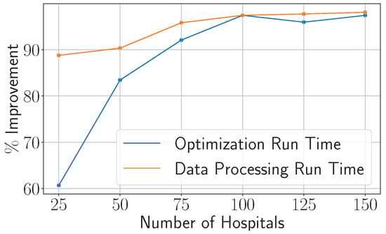 Reduction in the optimization and data processing run time as a function of problem size (number of hospitals).